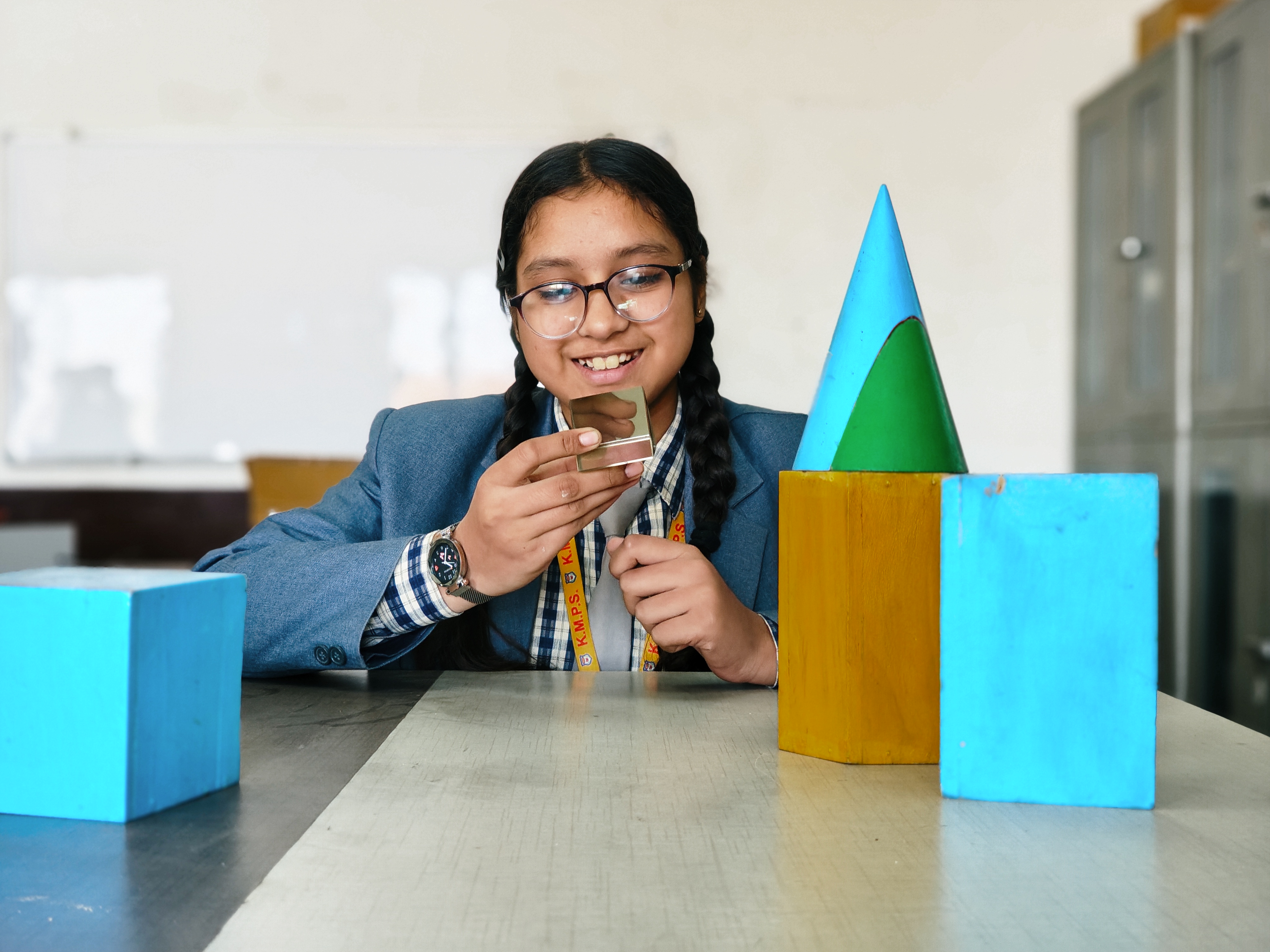 Math needs practice, interest and brainpower which are fostered by the Math lab. The KMPS Math Lab makes Math simple and fun for students. The lab is well equipped to demonstrate any topic. It also enables the teachers to reinforce Mathematical concepts. Hence, it helps in mental enhancement of students in any area of Math like Algebra, Arithmetic, Calculus, Geometry, Statistics, and Trigonometry etc.